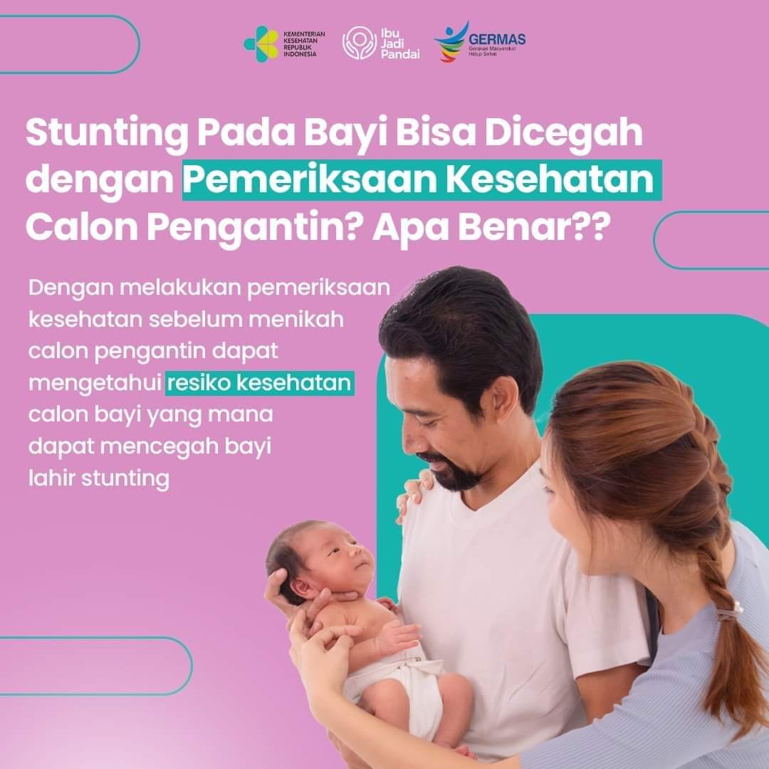 pemeriksaan kesehatan bagi calon pengantin dapat berkontribusi mengurangi bayi lahir stunting, dikarenakan wanita dapat mempersiapkan atau mengobati pencetusnya loh !