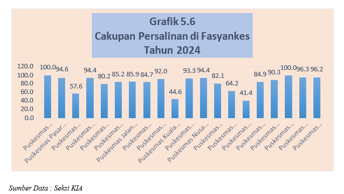 Pada grafik 5.6 dapat dilihat distribusi persalinan di fasilitas kesehatan berdasarkan Puskesmas di Kota Bengkulu tahun 2024. Sasaran persalinan di Kota Bengkulu tahun 2024 sebesar 7.521 orang dan capaian cakupan persalinan di fasyankes sebesar 84,7% (6.374 orang). Adapun capaian cakupan persalinan di Fasyankes oleh tertinggi di Puskesmas Telaga Dewa sebanyak 537 orang (90,3%), Puskesmas Jembatan Kecil sebanyak 551 orang (96,2%) dan Puskesmas Kandang 436 orang (92,0%), dan capaian cakupan persalinan di fasyankes terendah di Puskesmas Lempuing sebanyak 131 orang dari 294 orang sasaran (44,6%).